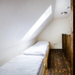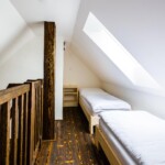 Ložnice : manželské dvojlůžko + 2x jednolůžko v podkroví, pracovní stůl a šatní skříň, blackout závěsy