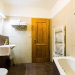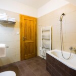 Koupelna : vana, umyvadlo, toaleta, ručníky, sprchový gel, šampon, fén na vlasy