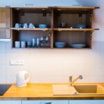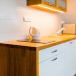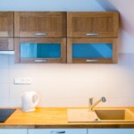 Vybavení kuchyně : dvouplotýnková indukční varná deska, mikrovlnná trouba s grilem, lednice s mrazákem, rychlovarná konvice, hrnce, pánev, příbory, talíře, hrnky, skleničky, otvírák, cedník, škrabka, lis na česnek, vařečka, nože, prkénko