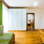 Kuchyně : rozkládací pohovka (plnohodnotné dvojlůžko), plně vybavená kuchyňská linka, šatní skříň, smart TV, jídelní stůl s židlemi, blackout závěsy