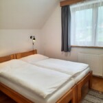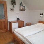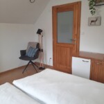 Dvoulůžkový pokoj s manželskou postelí je umístěn v prvním patře přístavby penzionu. Pokoj je vybaven šatní skříní, smart TV a psacím stolem. Pokoj má vlastní koupelnu s vanou a toaletou. Ideální ubytování pro páry nebo rodiny s malým dítětem (možnost umístit přistýlku nebo dětskou postýlku).