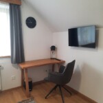 Pokoj : manželské dvojlůžko, smart TV, psací stůl, skříňka, blackout závěsy