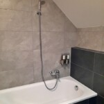 Koupelna : vana, umyvadlo, toaleta, ručníky, sprchový gel, šampon, fén na vlasy